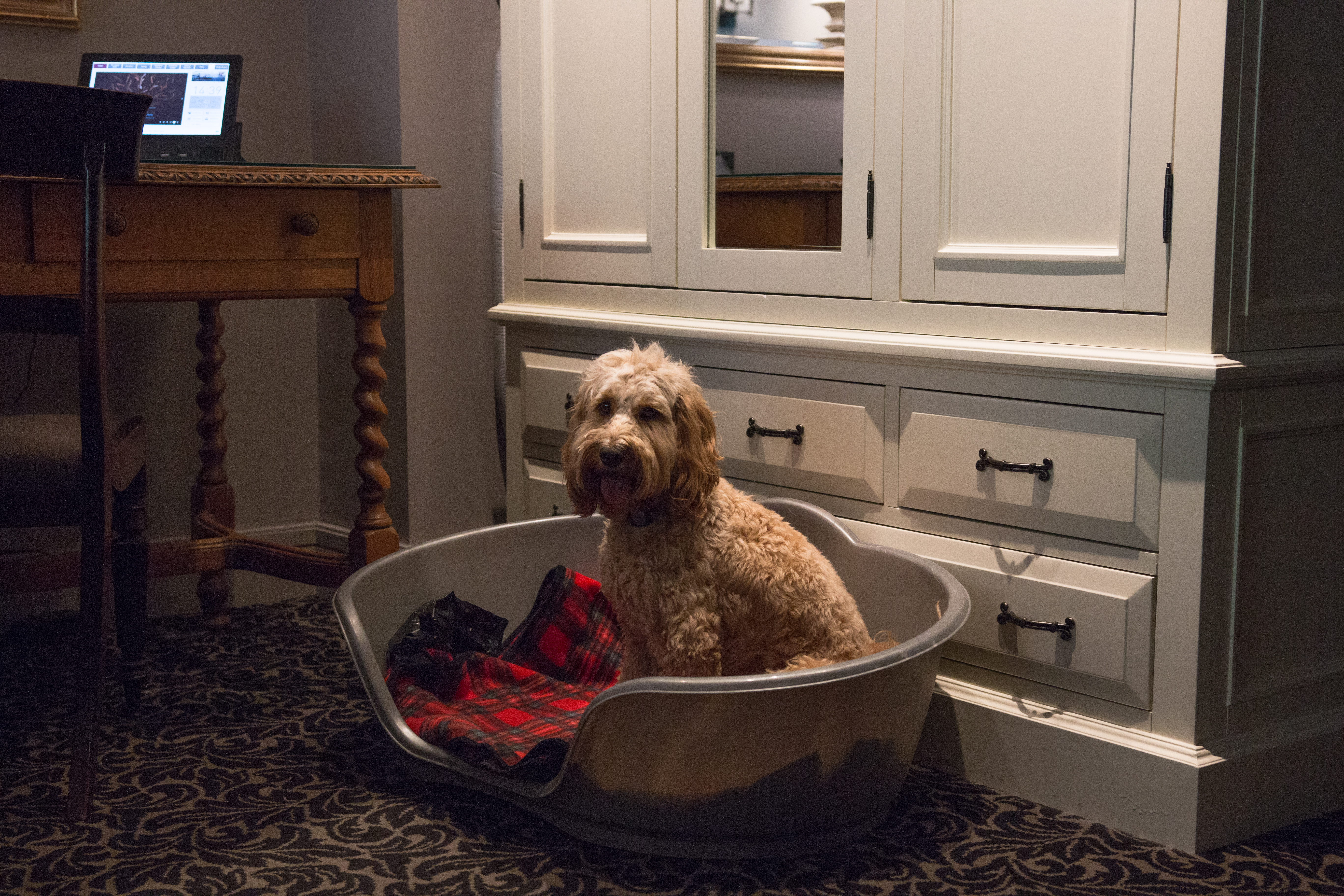 When leaving the dogs alone in the room there’s a special do not disturb sign for pets. This means staff see this and don’t disturb your dogs or upset them with a stranger going in to clean or fill up your mini bar.